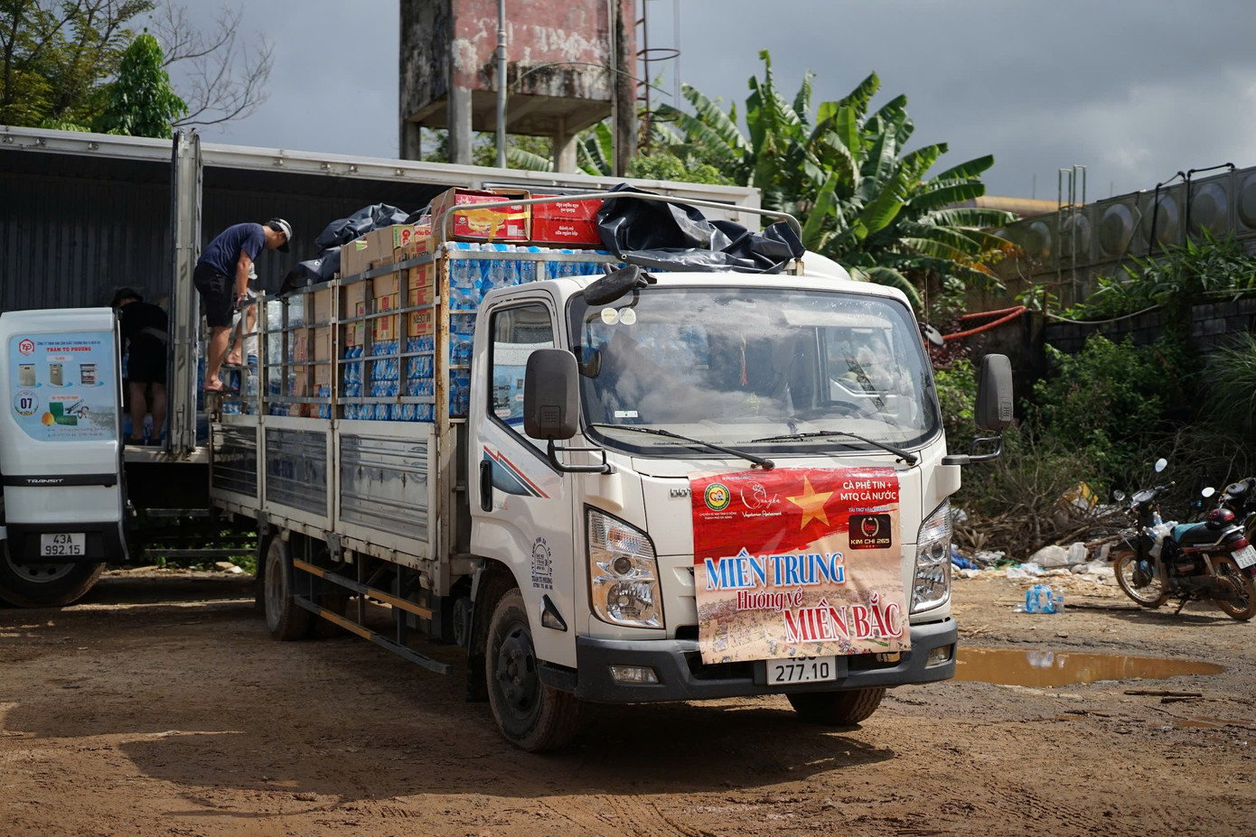 Xe chở theo hơn 20 tấn hàng cứu trợ đến với vùng lũ.
