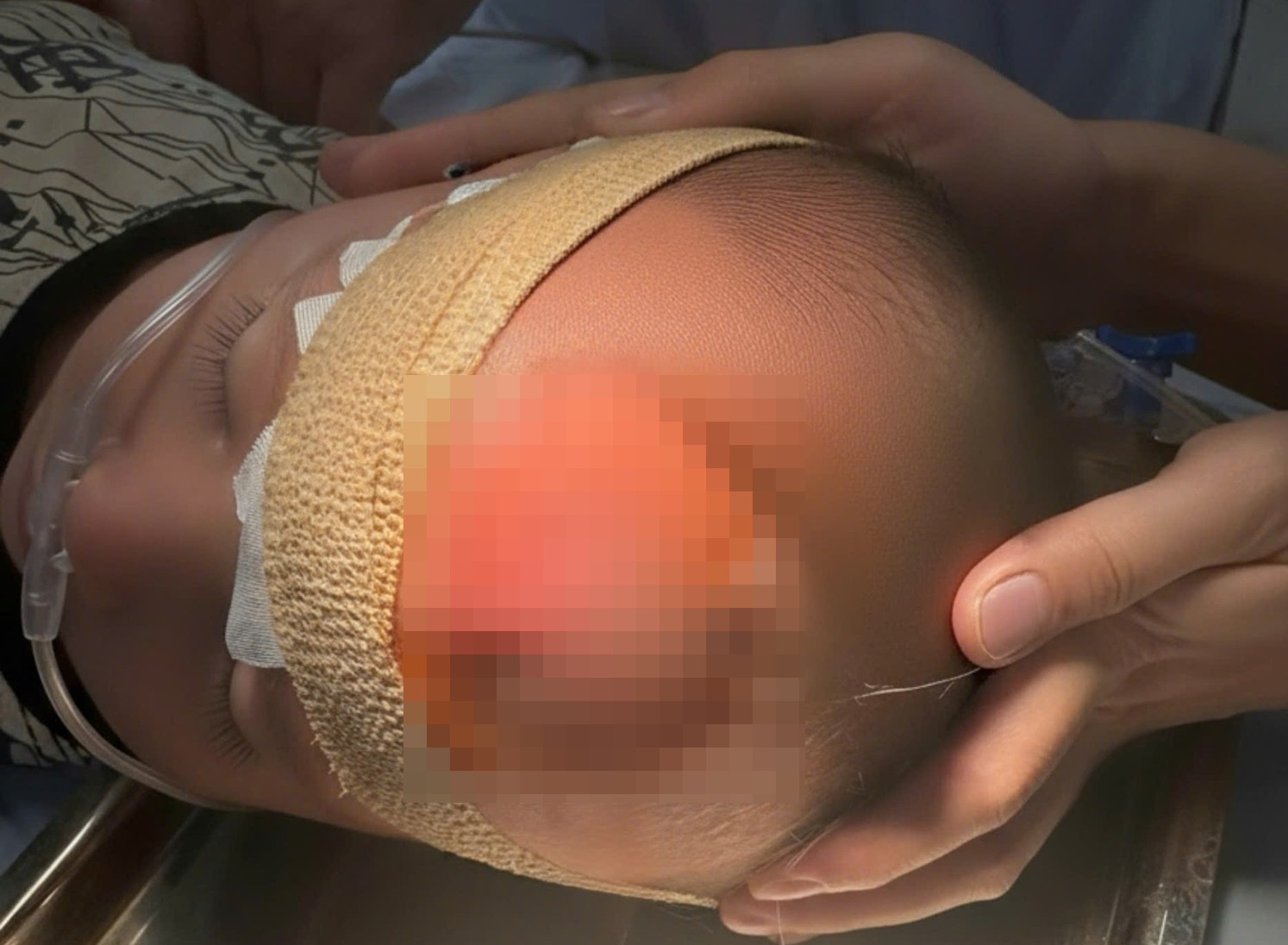Qua thăm khám và xét nghiệm, bác sĩ xác định bé bị áp xe vùng trán kích thước 4x5 cm - một dạng nhiễm trùng khu trú dưới da. Nếu không điều trị sớm và đúng cách, áp xe có thể lan rộng hoặc gây biến chứng nguy hiểm như viêm mô tế bào, nhiễm trùng máu, thậm chí ảnh hưởng đến não.