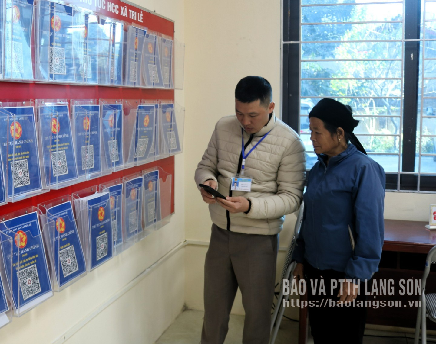 Chuyên viên Trung tâm Phục vụ hành chính công xã Tri Lễ hướng dẫn người dân thực hiện thủ tục qua dịch vụ công trực tuyến trên điện thoại thông minh
