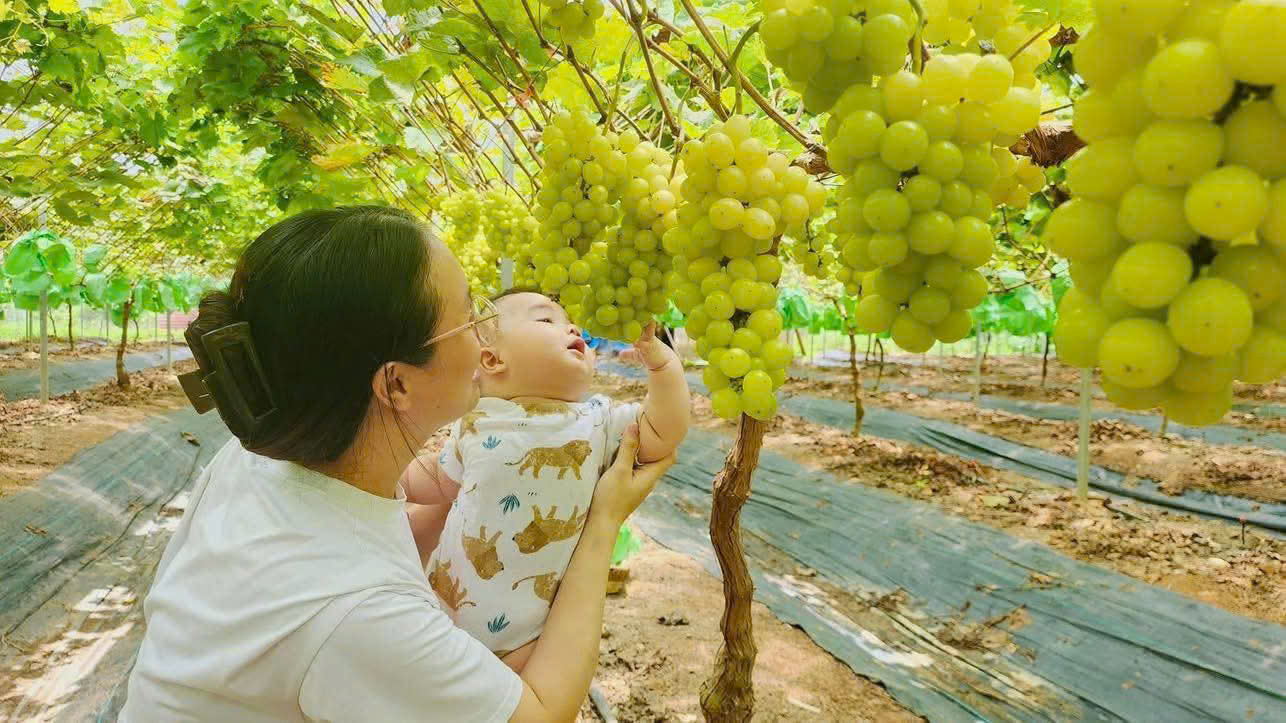 Khung cảnh nơi đây khiến ai cũng ngỡ ngàng: thay cho những thửa ruộng lúa bạt ngàn năm nào là những giàn nho xanh mướt, quả sai trĩu trịt đung đưa trong gió. Trên các lối đi nhỏ, du khách thong dong chụp ảnh, hái nho, thưởng thức vị ngọt thanh mát ngay giữa làng quê thanh bình.