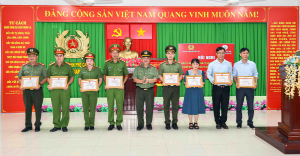 Đại tá Nguyễn Thanh Tràng, Phó Giám đốc Công an TP Cần Thơ trao Giấy khen của Công an thành phố tặng 10 cá nhân có thành tích xuất sắc trong công tác phối hợp tổ chức và triển khai mô hình “Tủ sách hướng thiện” giai đoạn 2021 - 2025.