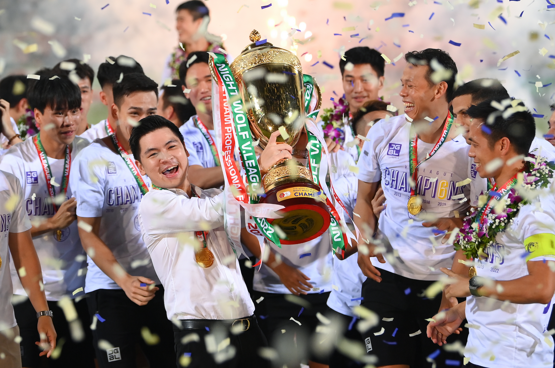 Ông Đỗ Vinh Quang và khoảnh khắc chia sẻ niềm vui vô địch V-League với các thành viên Hà Nội FC