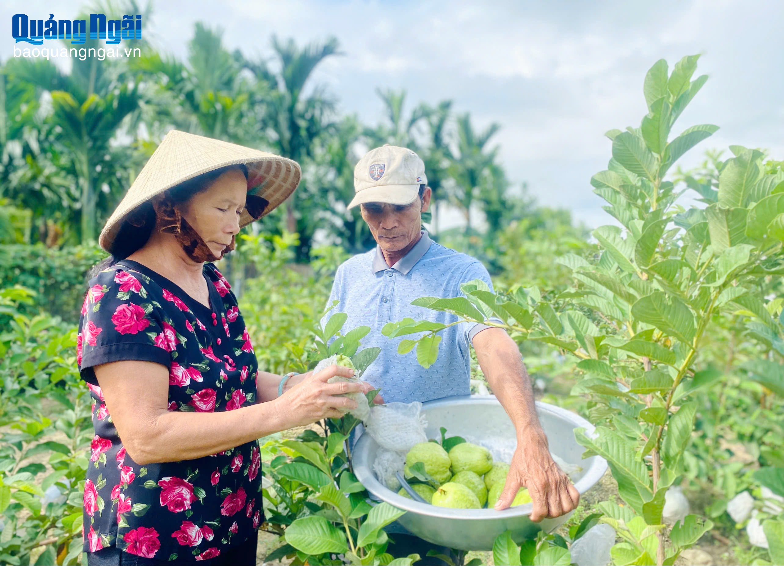 Bà Văn Thị Vân, ở thôn Hà Nhai Bắc, xã Sơn Tịnh cùng chồng thu hoạch ổi. Ảnh: HIỀN THU