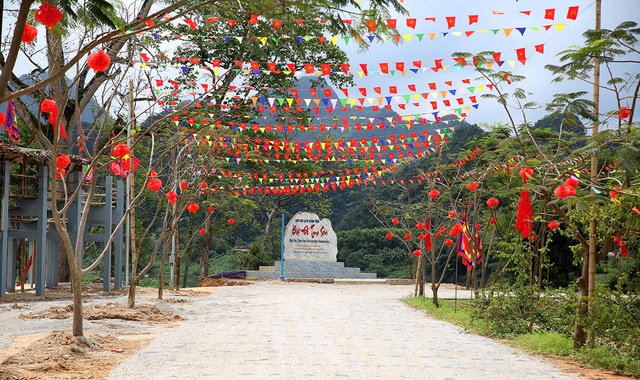Lối vào khu vực lễ hội rực rỡ cờ hoa, mang đậm không khí truyền thống vùng quê Nghệ An.