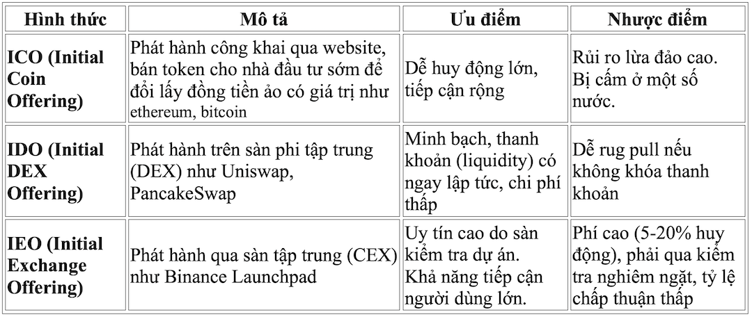Phát hành token là quá trình tạo ra một đồng tiền kỹ thuật số trên blockchain. Có nhiều cách phát hành để huy động vốn và phân phối token như ICO, IDO, IEO ...Trong các cách phát hành này, ICO là cách được nhiều dự án chọn nhờ dễ thực hiện, tuy nhiên kèm theo đó lại có độ rủi ro cao cho nhà đầu tư.