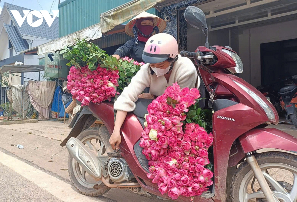 Thương lái thu mua hoa hồng tại vườn, vận chuyển bằng xe máy để kịp giao cho các mối chợ đầu mối.