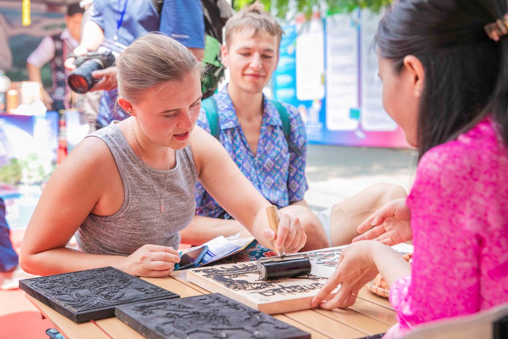 Không gian “chạm về bản sắc” mang đến trải nghiệm làng nghề truyền thống, nổi bật là hoạt động làm gốm, khám phá sản phẩm thủ công của làng gốm Thanh Hà và sáng tạo tranh mộc bản. Mỗi sản phẩm không chỉ là món quà lưu niệm mà còn chứa đựng câu chuyện văn hóa sống động.