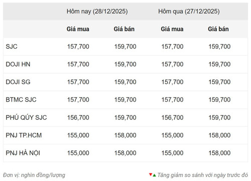 Cụ thể, tại thời điểm 16 giờ ngày 28/12, Công ty Vàng bạc đá quý Sài Gòn (SJC) niêm yết giá vàng miếng SJC mua vào-bán ra ở mức 157,7-159,7 triệu đồng/lượng. Chênh lệch mua-bán 2 triệu đồng/lượng.