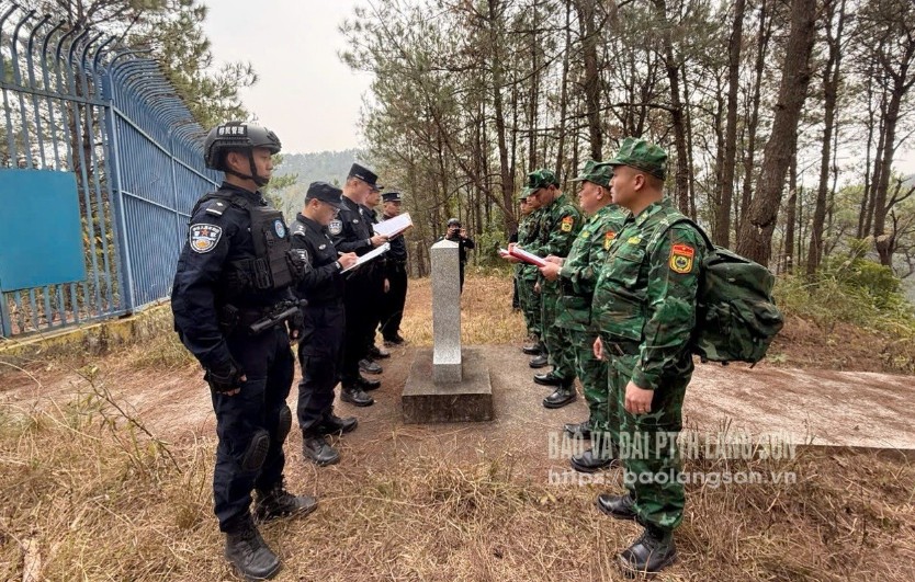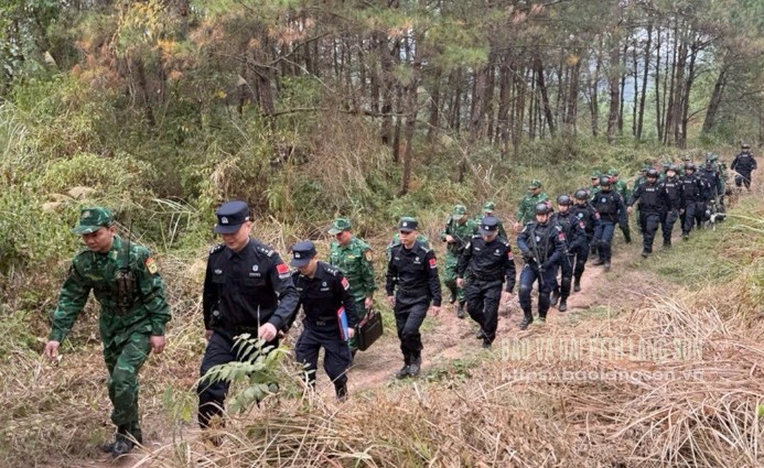 Cán bộ, chiến sĩ Đồn Biên phòng Cửa khẩu Chi Ma và lực lượng thuộc Đại đội quản lý biên giới Ninh Minh, Trung Quốc tuần tra song phương ở khu vực mốc 1227