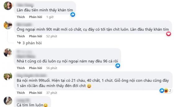 Qua hình ảnh, nhiều người bình luận cho biết họ hiếm khi thấy khăng tang màu tím, bởi hiếm ai trong gia đình sống thọ đến tuổi gần 100 và may mắn đã có chít.