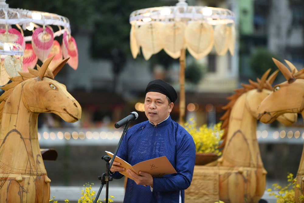 Ông Lê Xuân Kiêu, Giám đốc Trung tâm hoạt động Văn hóa Khoa học Văn Miếu - Quốc Tử Giám phát biểu tại lễ khai mạc