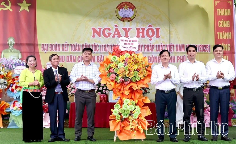 Thay mặt Tỉnh ủy - HĐND - UBND - Ủy ban MTTQ Việt Nam tỉnh, Phó Chủ tịch UB MTTQ Việt Nam tỉnh Khổng Mạnh Hùng và lãnh đạo các sở, ngành tặng hoa chúc mừng Khu dân cư xóm Bãi Chạo