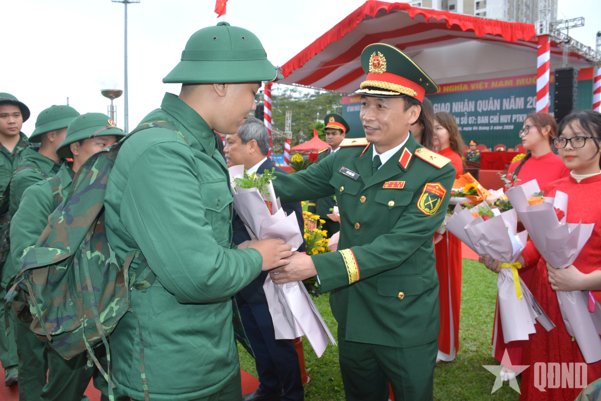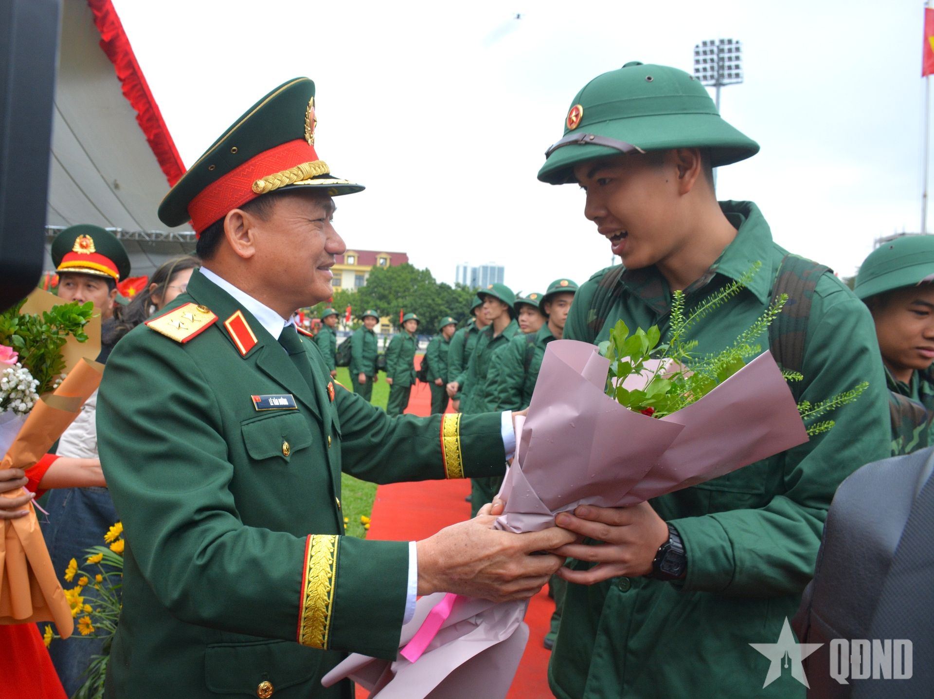 Trung tướng Lê Văn Hướng, Phó tổng Tham mưu trưởng tặng hoa, động viên thanh niên lên đường nhập ngũ.