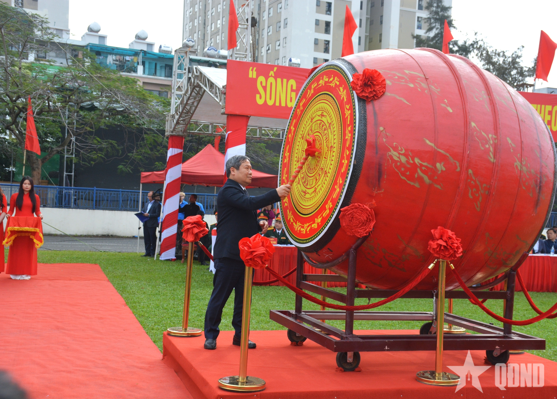 Đồng chí Vũ Đại Thắng, Chủ tịch UBND TP Hà Nội đánh trống khai hội tòng quân.
