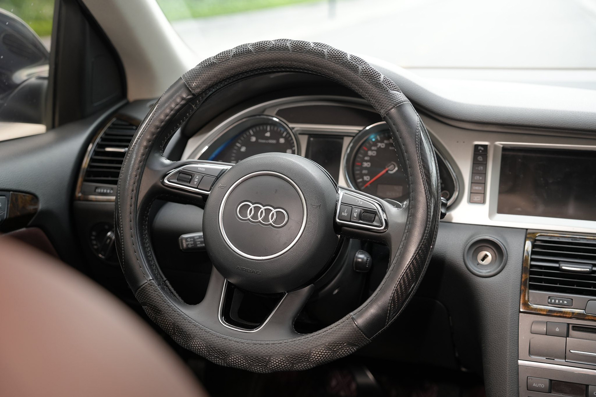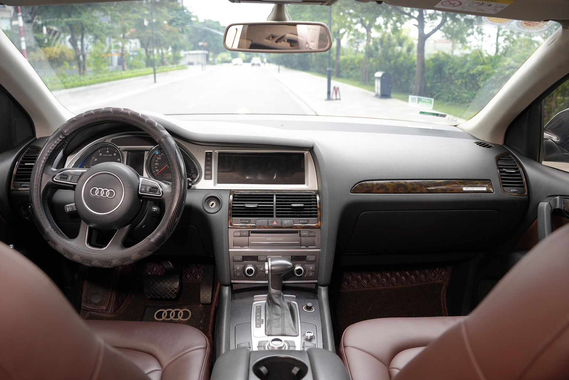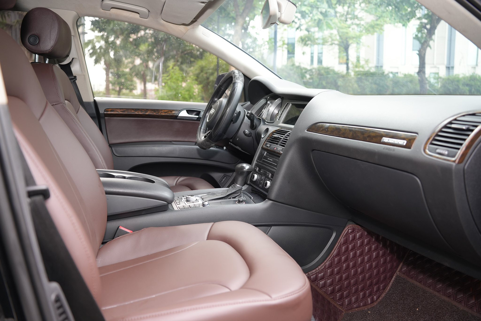 Nội thất chiếc Audi Q7 này mang tông màu nâu đỏ lạ mắt, kết hợp cùng màu đen ở nhiều vị trí. Một số chi tiết ốp gỗ màu nâu sẫm trang trí như táp-lô, viền cửa gió điều hòa, bảng điều khiển trung tâm, táp-pi cửa.