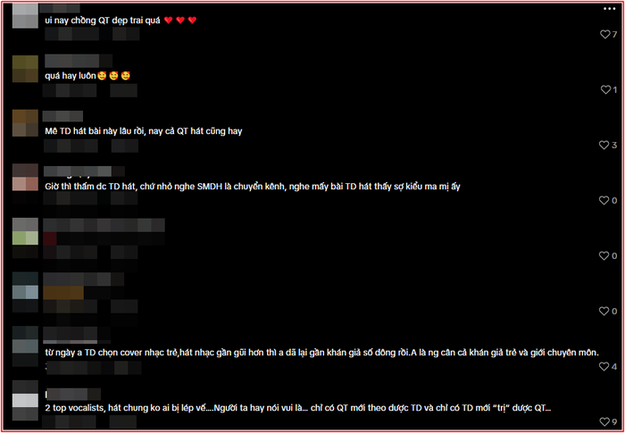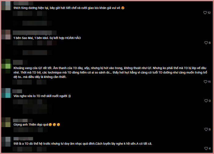 Không phải ngẫu nhiên mà nhiều khán giả để lại bình luận: "Hai ông giọng đỉnh nhất" hay "Hát chung không ai bị lép vế". Trong một màn song ca, việc không ai bị "nuốt" giọng hay mờ nhạt đã là thành công, nhưng để đạt đến sự cân bằng như Tùng Dương và Quốc Thiên lại càng hiếm. Có lẽ vì thế, cư dân mạng mới nói vui: "Chỉ có Quốc Thiên mới theo được Tùng Dương và chỉ có Tùng Dương mới trị được Quốc Thiên", một câu nói hài hước nhưng phần nào phản ánh đúng thực tế về đẳng cấp và bản lĩnh sân khấu của cả hai.