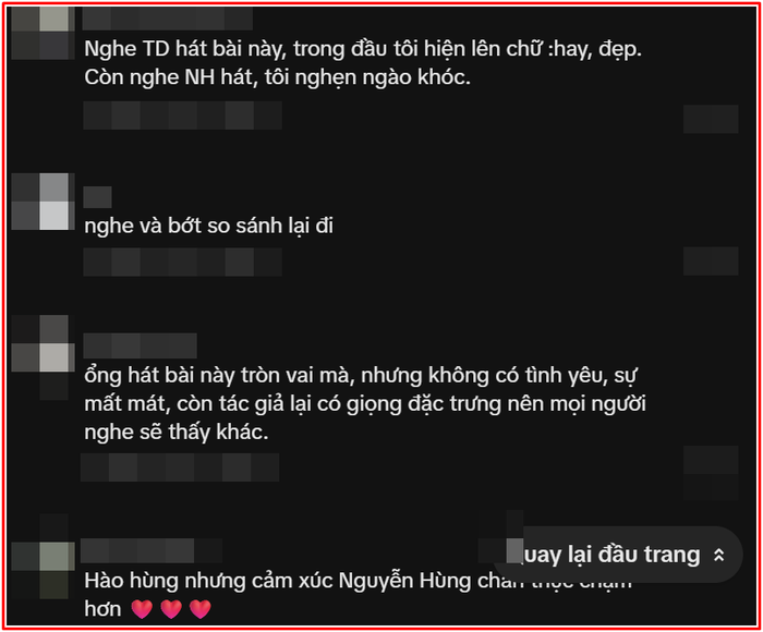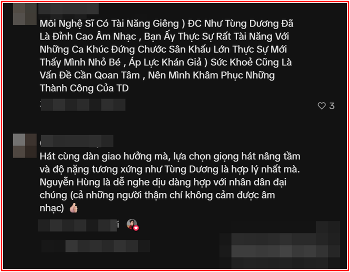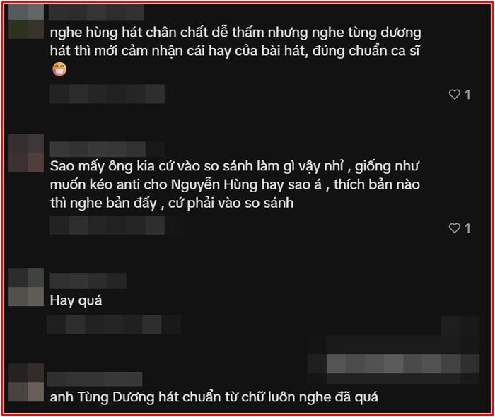 Đáng chú ý, một khán giả đã để lại bình luận cho rằng: "Hát cùng dàn giao hưởng mà, lựa chọn giọng hát nâng tầm và độ nặng tương xứng như Tùng Dương là hợp lý nhất mà. Nguyễn Hùng là dễ nghe dịu dàng hợp với nhân dân đại chúng (cả những người thậm chí không cảm được âm nhạc)". Ý kiến này được chính nam ca sĩ "thả tim" thể hiện sự đồng tình.