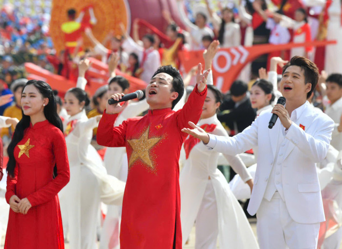 Tùng Dương và Hòa Minzy khi cùng nhiều nghệ sĩ biểu diễn trước Quảng trường Ba Đình vào ngày 2/9 năm ngoái. Ảnh: FBNV