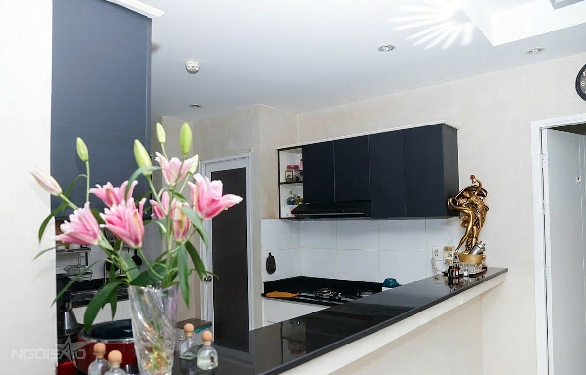 Do ít nấu nướng, Minh Thư không sắm nhiều đồ gia dụng để giữ cho khu bếp gọn gàng, thoáng đãng. Cô chọn màu trắng - đen cho khu vực này.