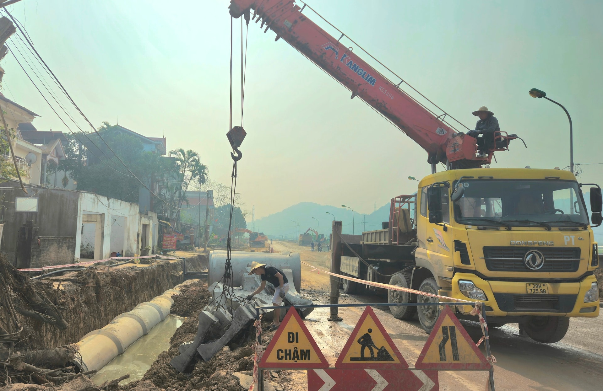 Nhiều máy móc, công nhân tất bật thi công trên công trường tỉnh lộ 413. Ảnh: Ánh Dương