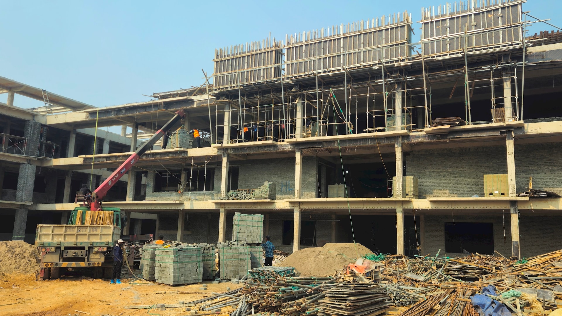 Các công nhân đang tập trung hoàn thiện công trình Trường Mầm non Trung Sơn Trầm. Ảnh: Ánh Dương