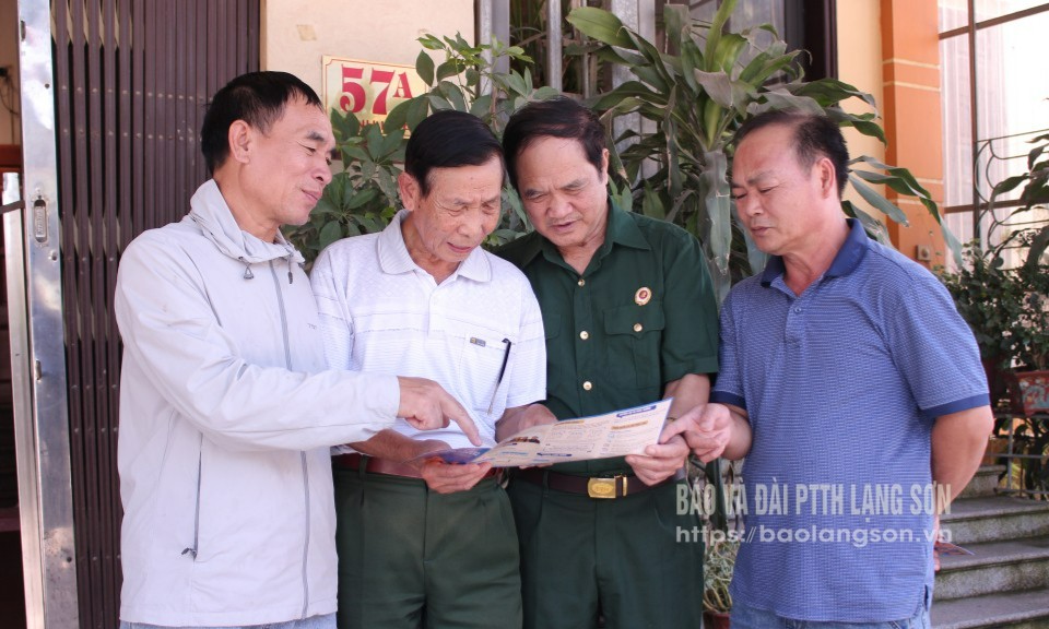 Ông Nguyễn Đức Nhuận, Bí thư Chi bộ, Trưởng khu Minh Khai, xã Lộc Bình (thứ 2 từ phải sang) tuyên truyền pháp luật đến người dân