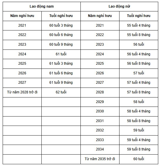 Từ năm 2028, lao động nam sẽ nghỉ hưu khi đủ 62 tuổi và từ năm 2035 trở đi, lao động nữ sẽ nghỉ hưu khi đủ 60 tuổi.
