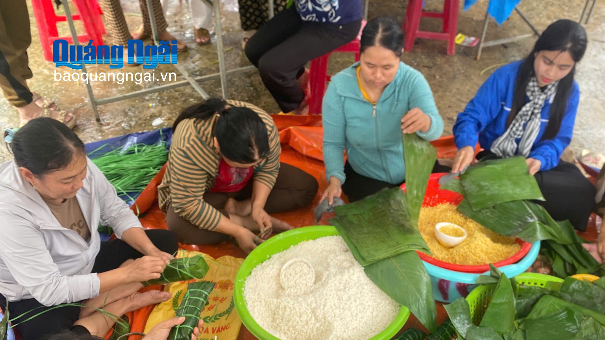 Thanh niên cùng người dân xã Ba Dinh cùng góp của, góp công làm bánh tét gửi đi tỉnh Đắk Lắk. Ảnh: ĐVCC