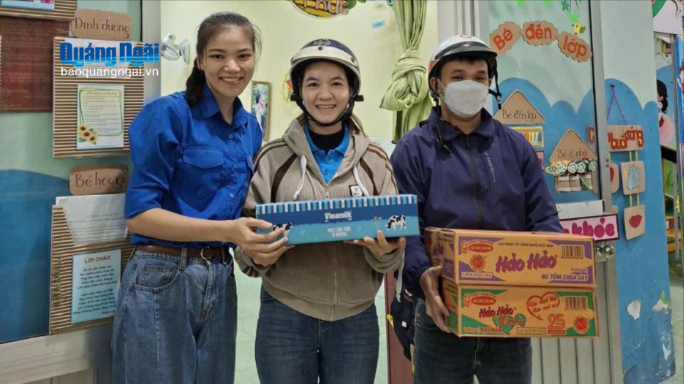 Đoàn Thanh niên xã Tịnh Khê tiếp nhận các vật phẩm hỗ trợ tại điểm trường mầm non. Ảnh: ĐVCC