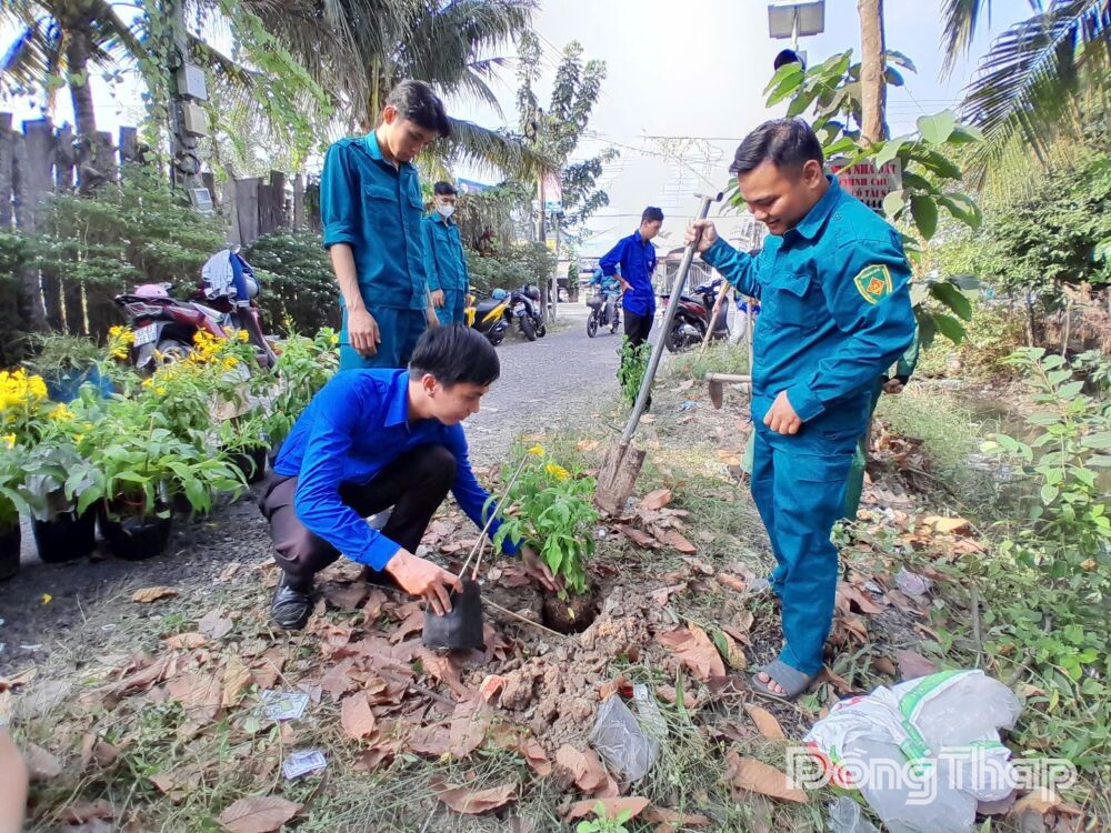 Đoàn viên tham gia thực hiện công trình trồng cây xanh, vệ sinh môi trường.