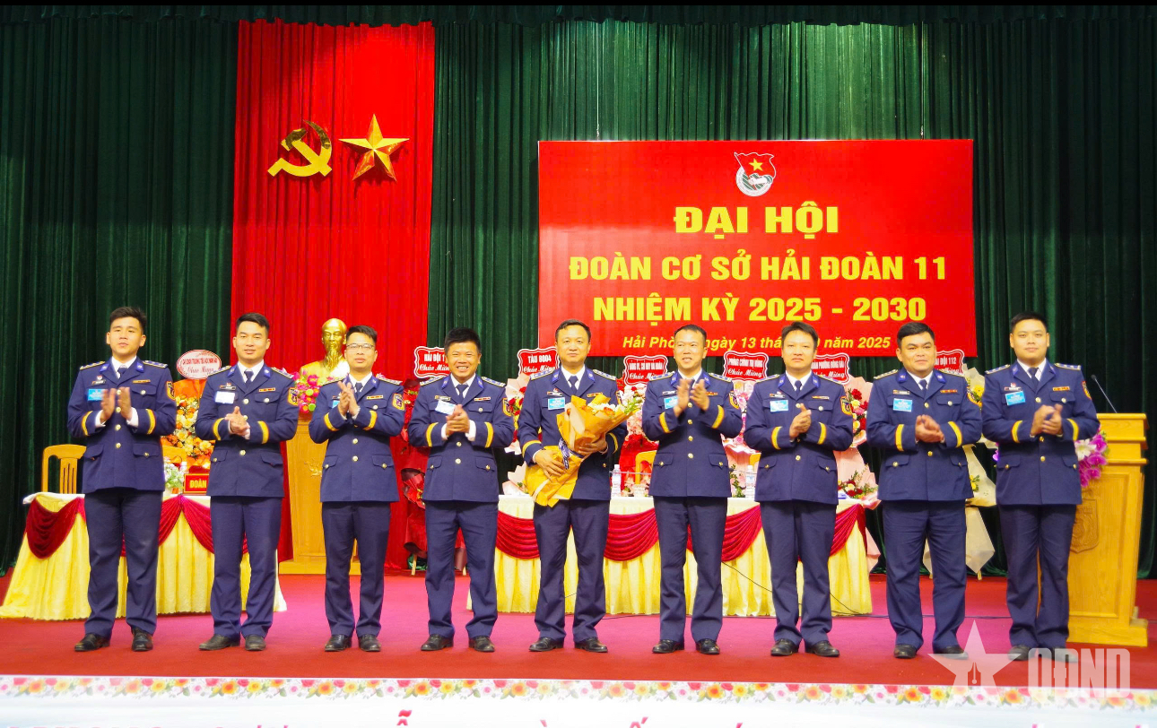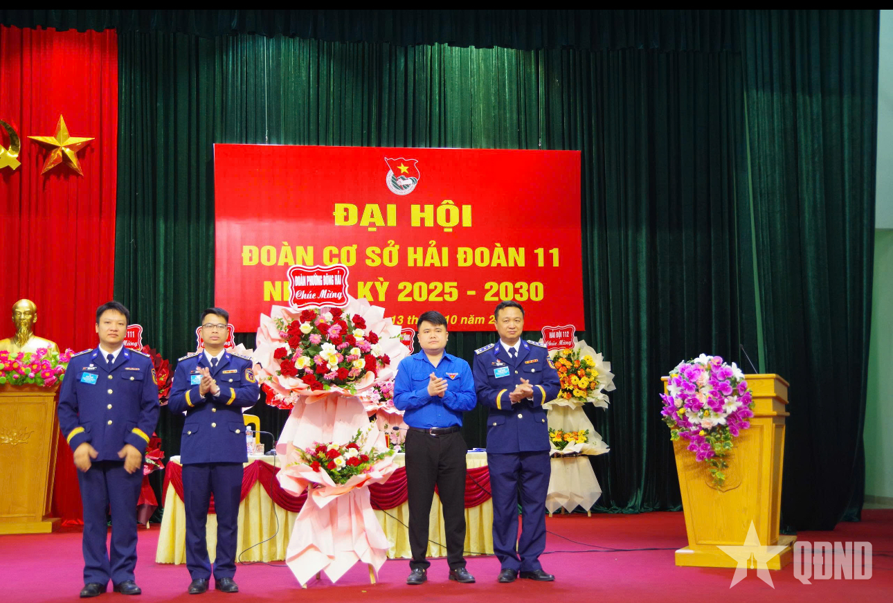 Đại biểu Phòng Chính trị, Bộ tư lệnh Vùng Cảnh sát biển 1 và thủ trưởng Hải đoàn 11 tặng hoa chúc mừng Ban chấp hành Đoàn cơ sở Hải đoàn 11 nhiệm kỳ 2025 – 2030.