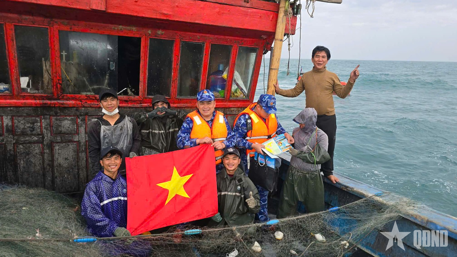 Tuyên truyền phòng, chống khai thác IUU và tặng cờ Tổ quốc cho ngư dân đánh bắt hải sản trên biển.