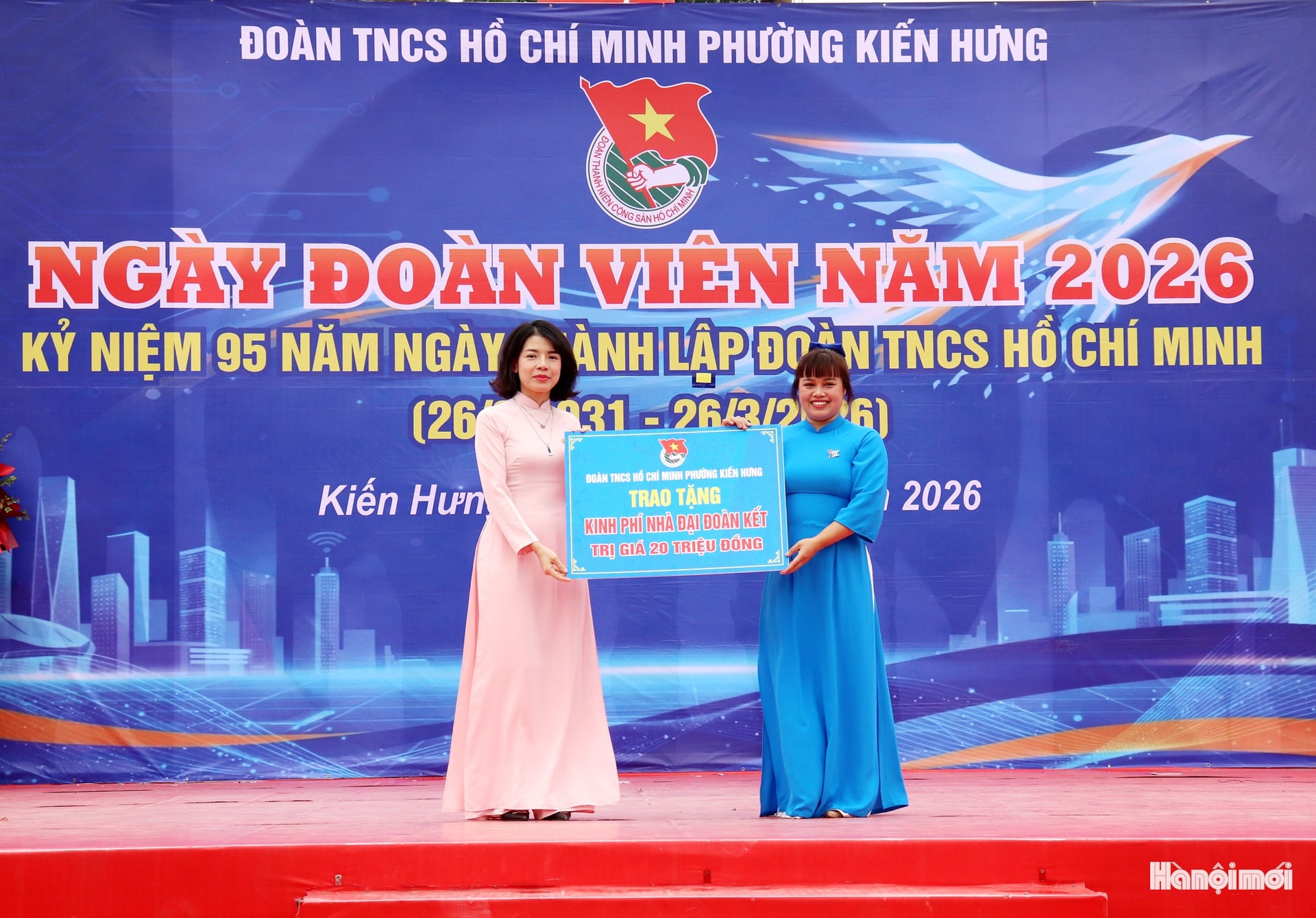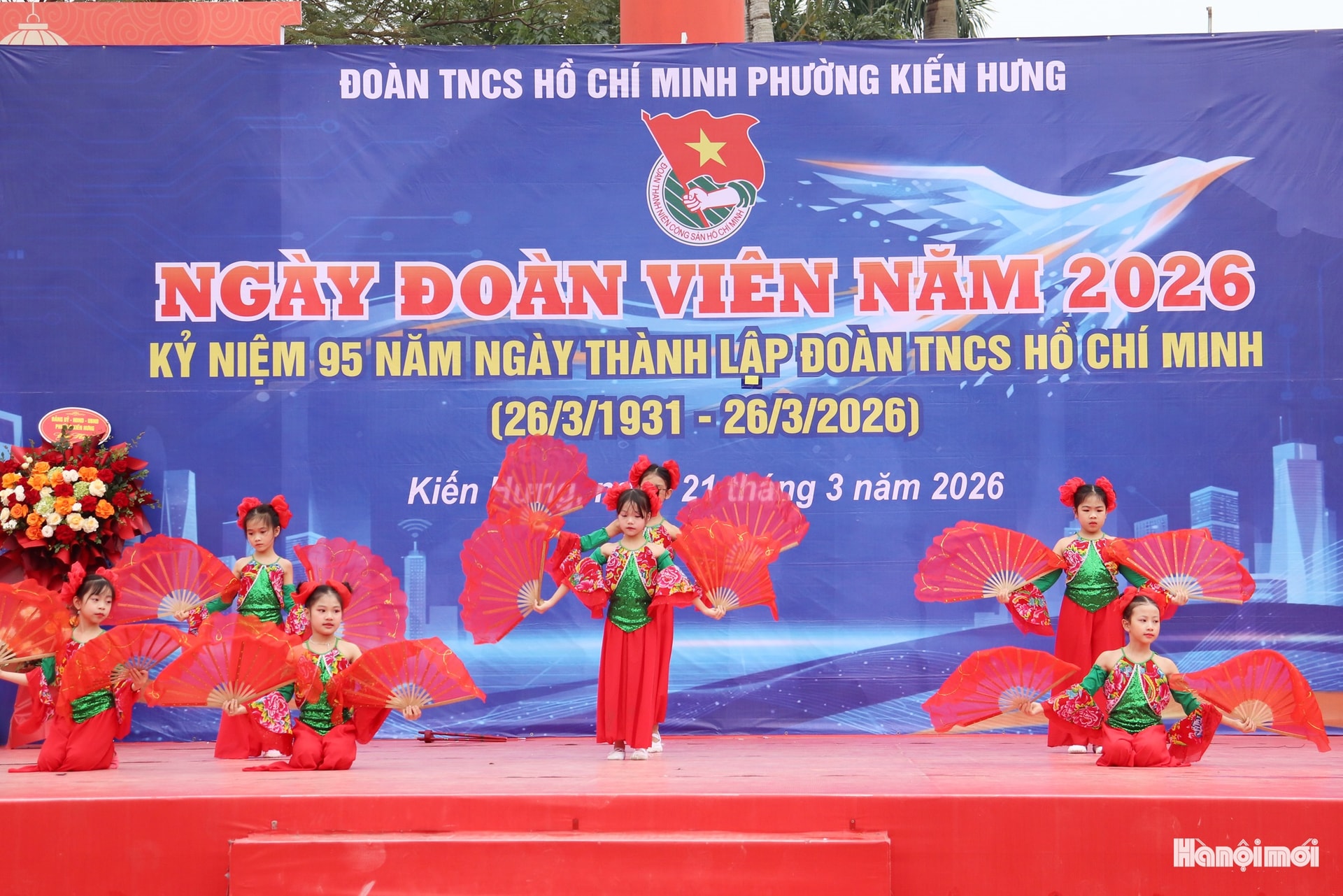 Lãnh đạo phường Kiến Hưng tặng hoa chúc mừng chương trình kỷ niệm 95 năm Ngày thành lập Đoàn TNCS Hồ Chí Minh. Ảnh: Tuấn Điệp