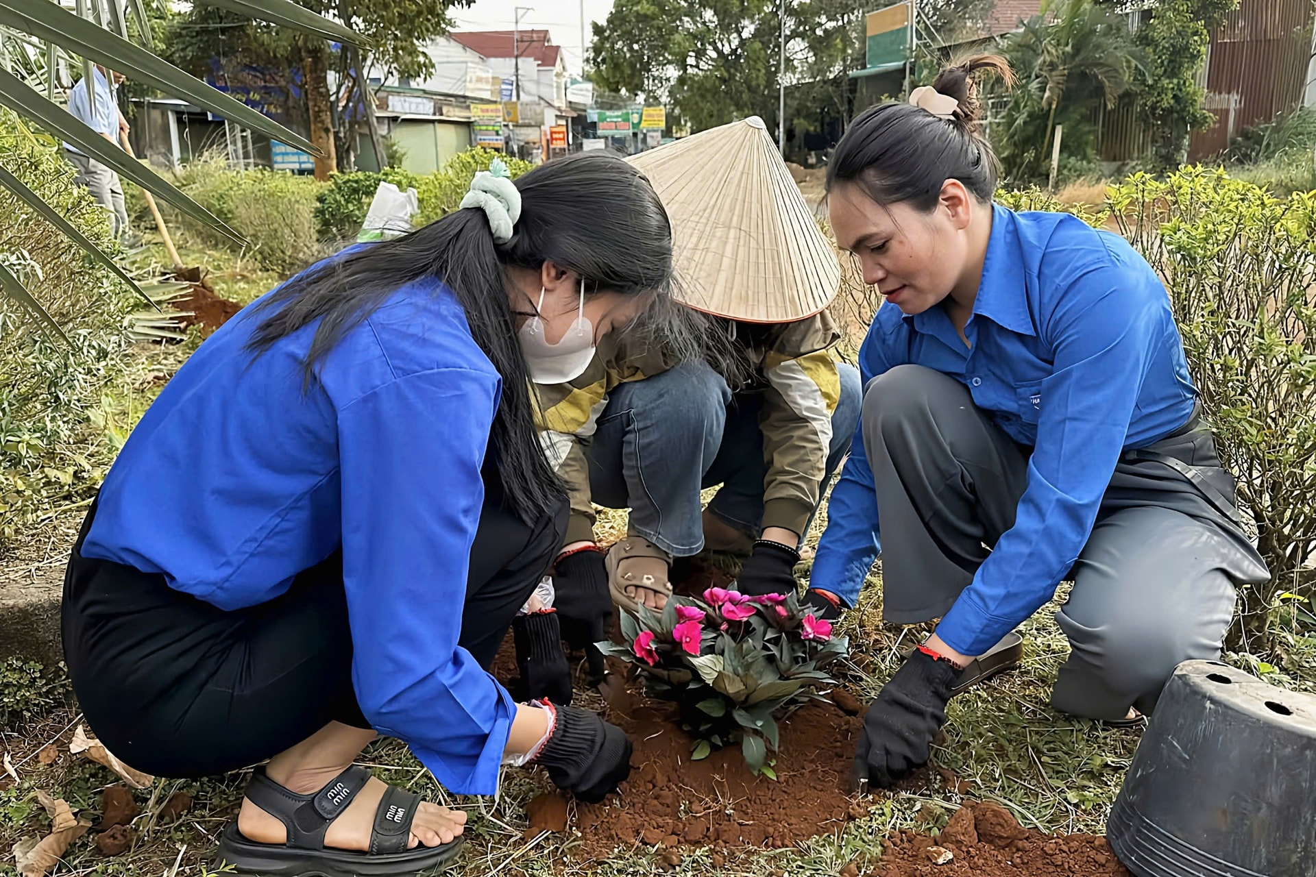 Tuổi trẻ xã Nhân Cơ tham gia trồng cây, hoa, tạo cảnh quan môi trường
