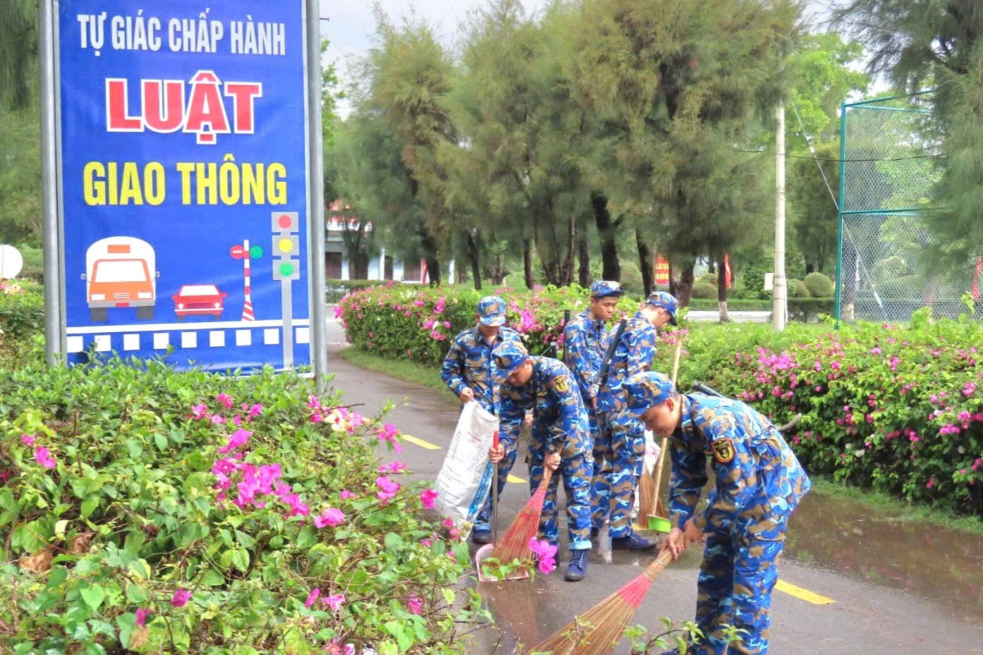 Dọn vệ sinh cảnh quan doanh trại.