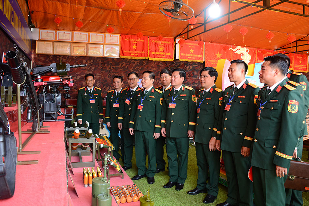 Thiếu tướng Nguyễn Trần Long và các đại biểu tham quan khu trưng bày tại Đại hội Đoàn cơ sở Trung đoàn 24 (Sư đoàn 10, Quân đoàn 34). Ảnh: ANH SƠN