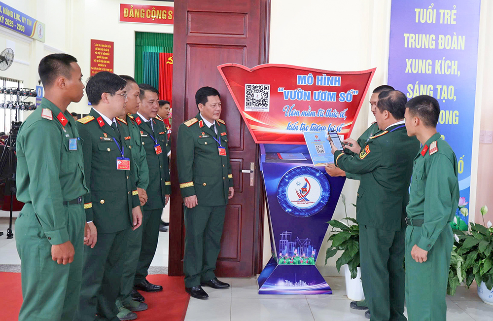 Thiếu tướng Nguyễn Trần Long và các đại biểu trải nghiệm mô hình “Vườn ươm số” tại Đại hội Đoàn cơ sở Trung đoàn 24 (Sư đoàn 10, Quân đoàn 34). Ảnh: ANH SƠN