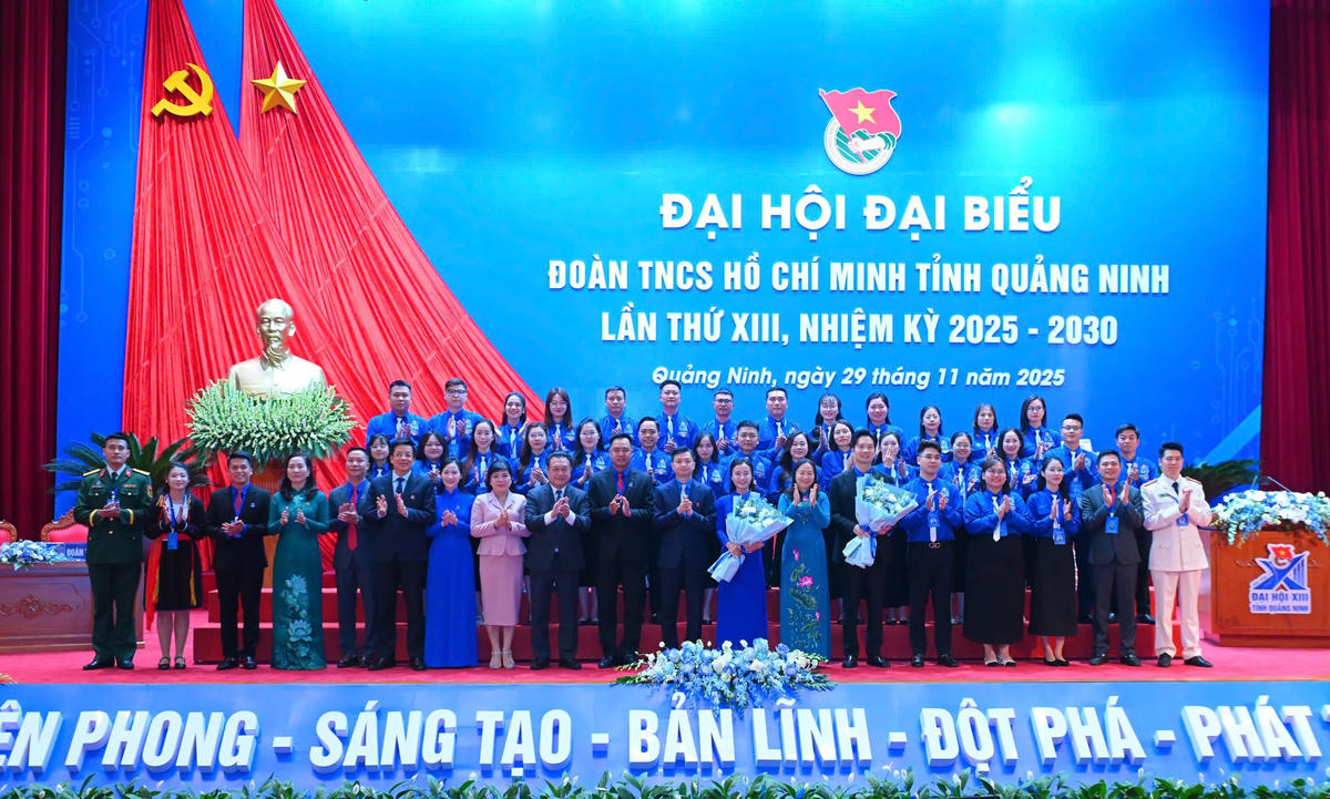 Lãnh đạo Trung ương Đoàn TNCS Hồ Chí Minh và tỉnh Quảng Ninh chúc mừng Ban Chấp hành Tỉnh đoàn Quảng Ninh khóa XIII. Ảnh: Ngọc Anh.