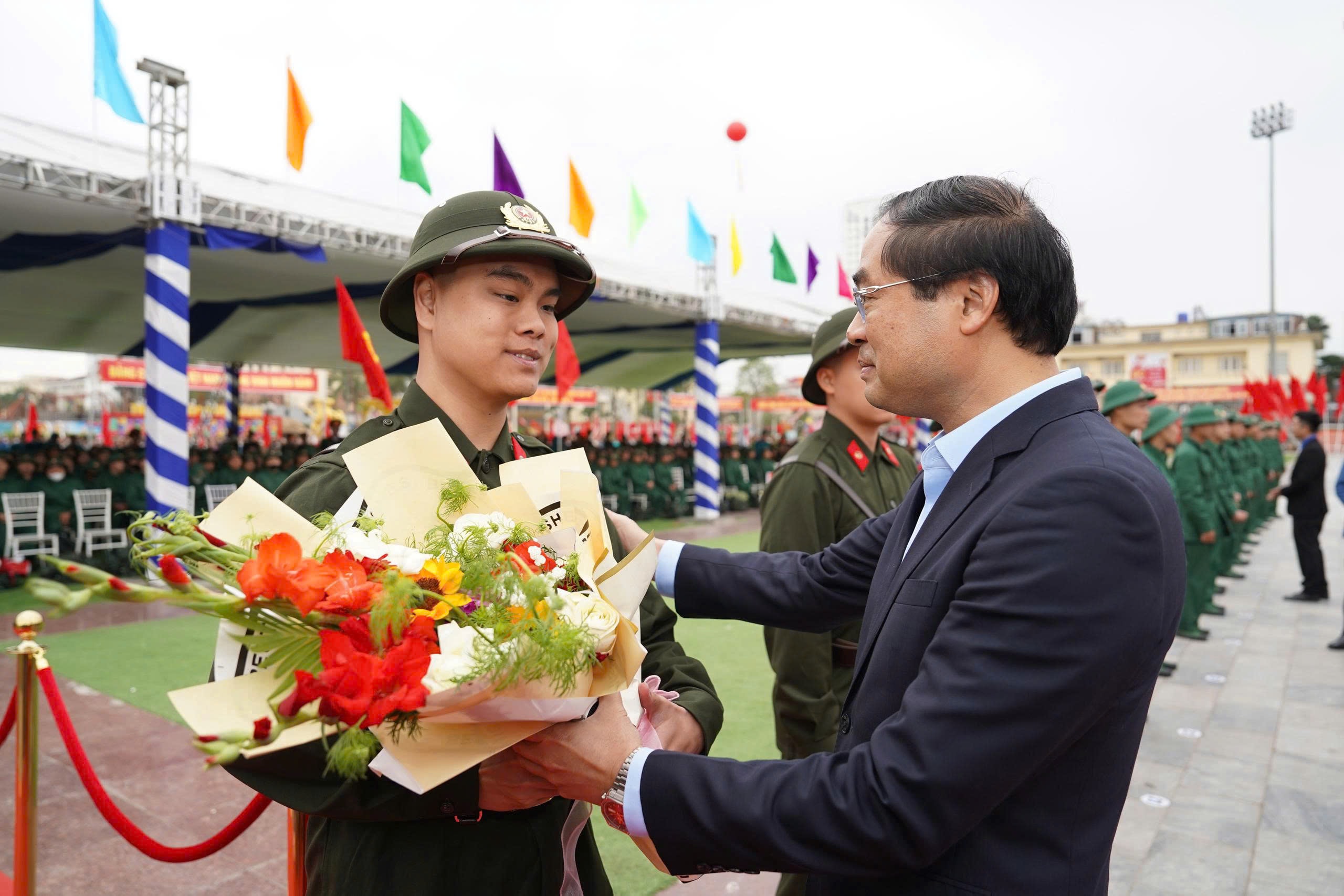 Bí thư Tỉnh ủy Trịnh Xuân Trường tặng hoa và động viên tân binh trước giờ lên đường nhập ngũ