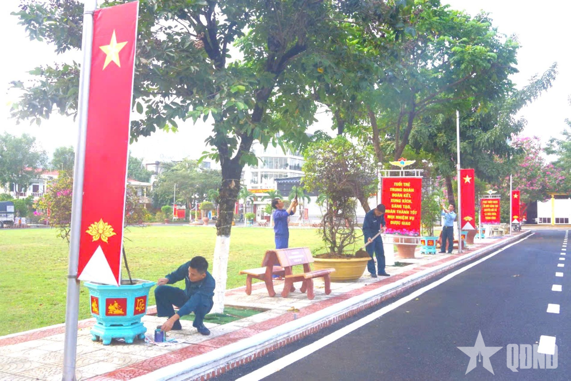 Thực hiện “Ngày chủ nhật xanh” củng cố, chăm sóc bồn hoa, cây cảnh, khuôn viên đơn vị.