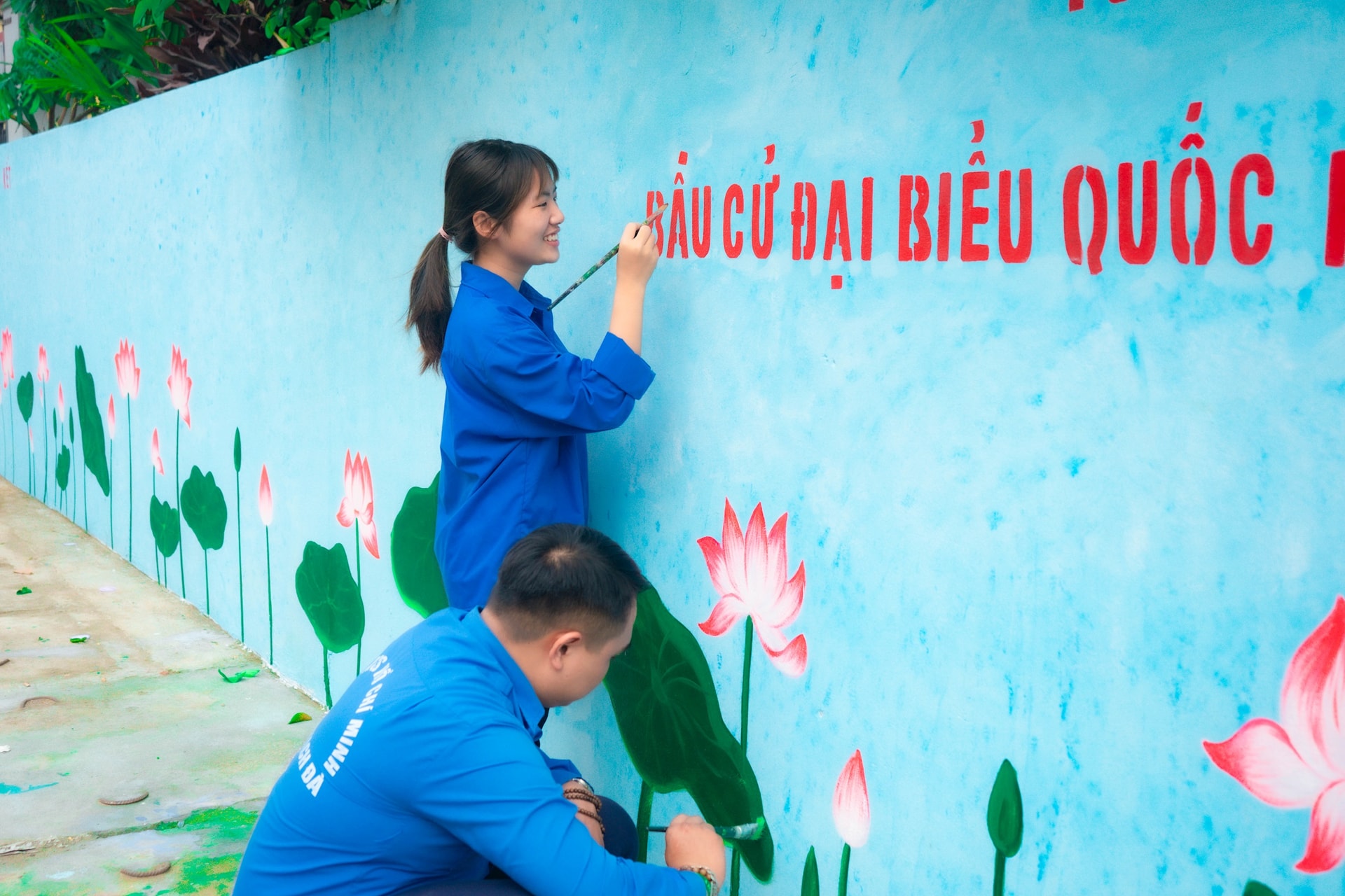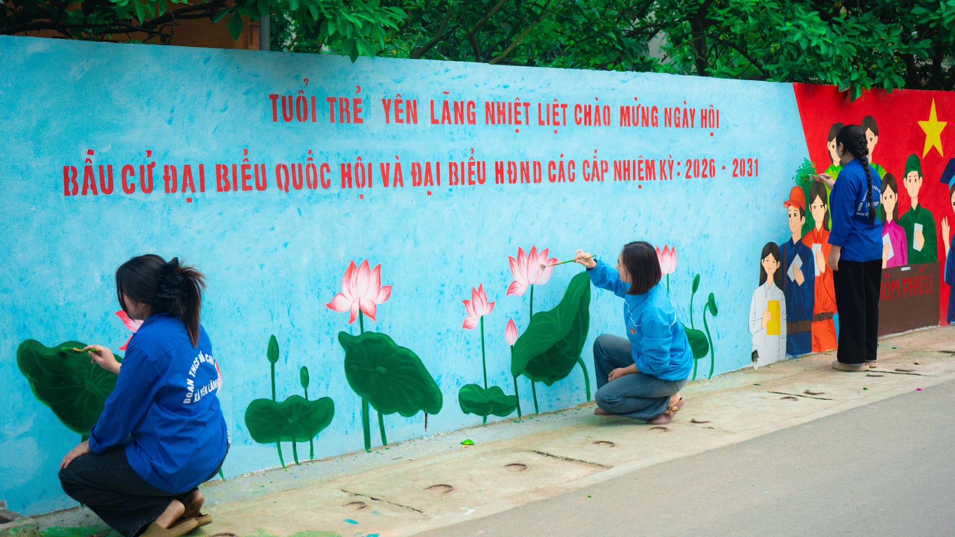 Đoàn viên, thanh niên xã Yên Lãng tham gia vẽ tranh tường tuyên truyền bầu cử trên địa bàn.