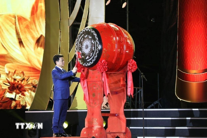 Ông Lê Ngọc Châu, Ủy viên Trung ương Đảng, Chủ tịch Ủy ban Nhân dân thành phố Hải Phòng khởi trống khai hội. (Ảnh: Mạnh Minh/TTXVN)