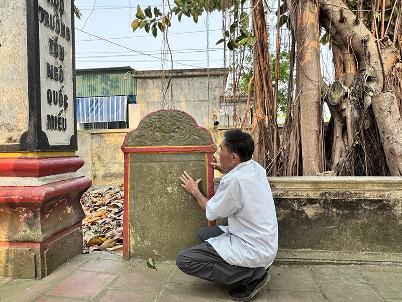 Do nhận thức sai lệch về các di sản văn hóa, tín ngưỡng, người dân “trang trí” màu mè trên di tích. (Ảnh chụp 1 trong 2 tấm bia tại nghè Ngọc Nhị).