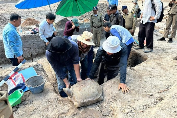 Tại Đền Bayon trong Công viên Khảo cổ Angor ở Siem Reap, Campuchia, các chuyên gia đến từ Cơ quan Quản lý Quốc gia APSARA bất ngờ khai quật được một bức tượng rùa bằng đá sa thạch quý hiếm ở độ sâu 1,5 mét. Ảnh: @ Cơ quan Quản lý Quốc gia APSARA.
