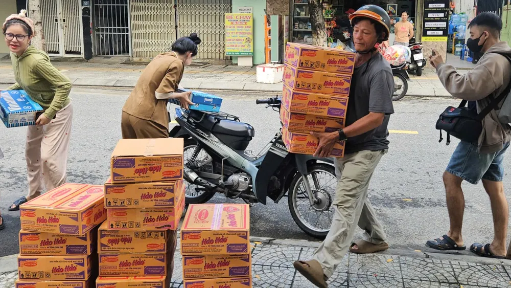 Tại 26 Tôn Đức Thắng (phường Hòa Khánh, Đà Nẵng), ngay từ sáng sớm, ông Lê Hiền (người dân địa phương) thuê xe tải chở đến 300 thùng mỳ tôm, nhờ đội cứu trợ chuyển cho người dân Thái Nguyên.