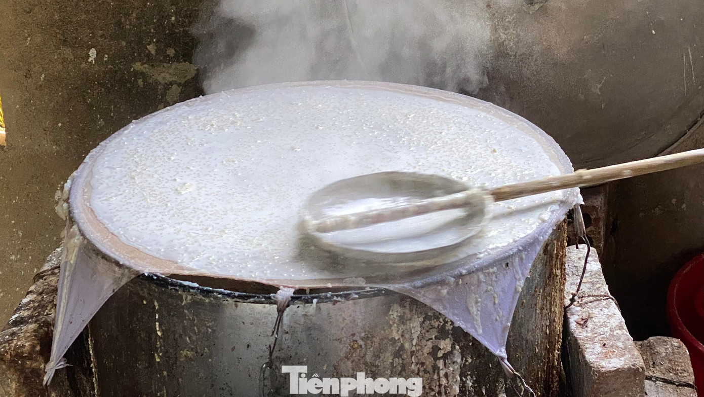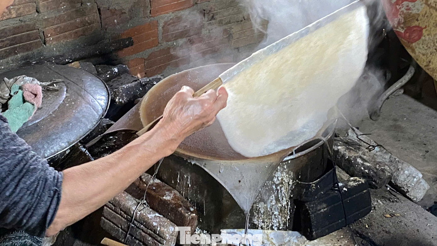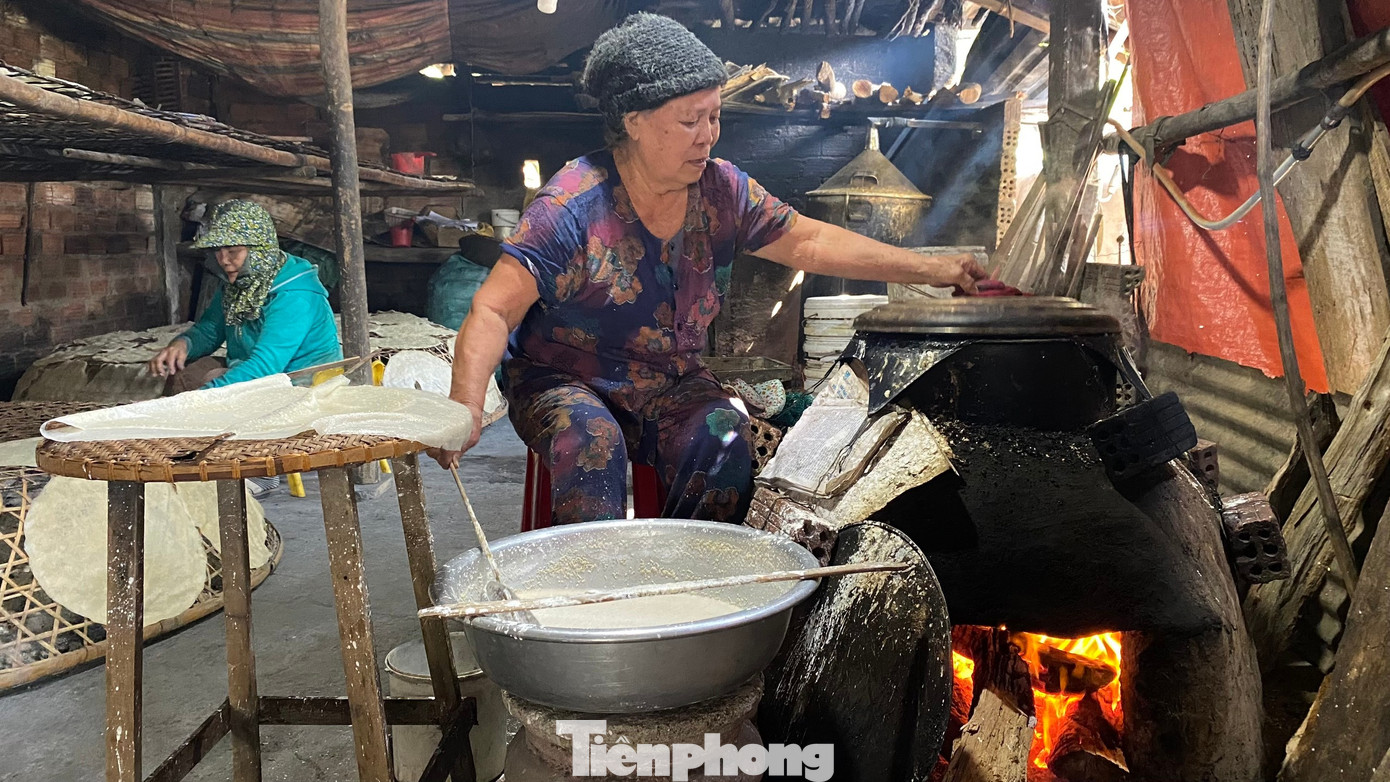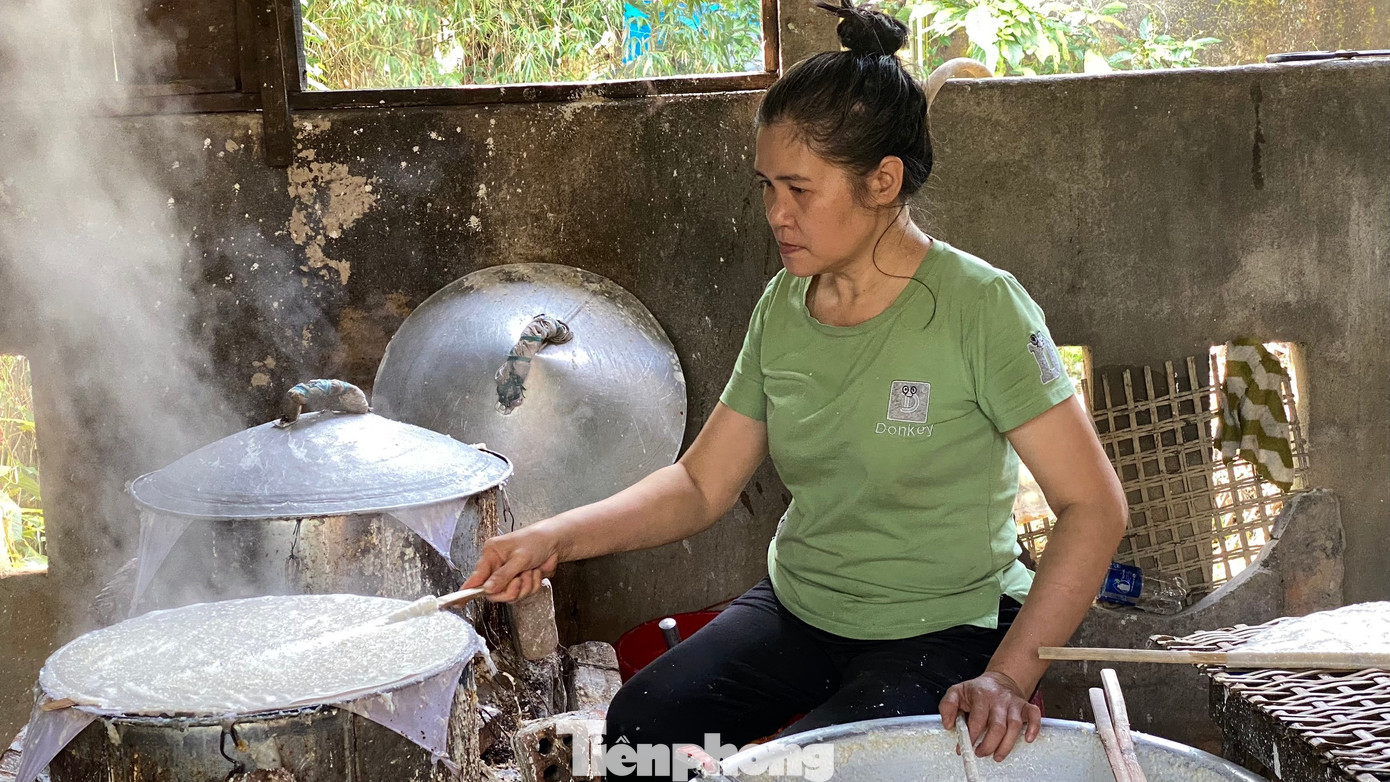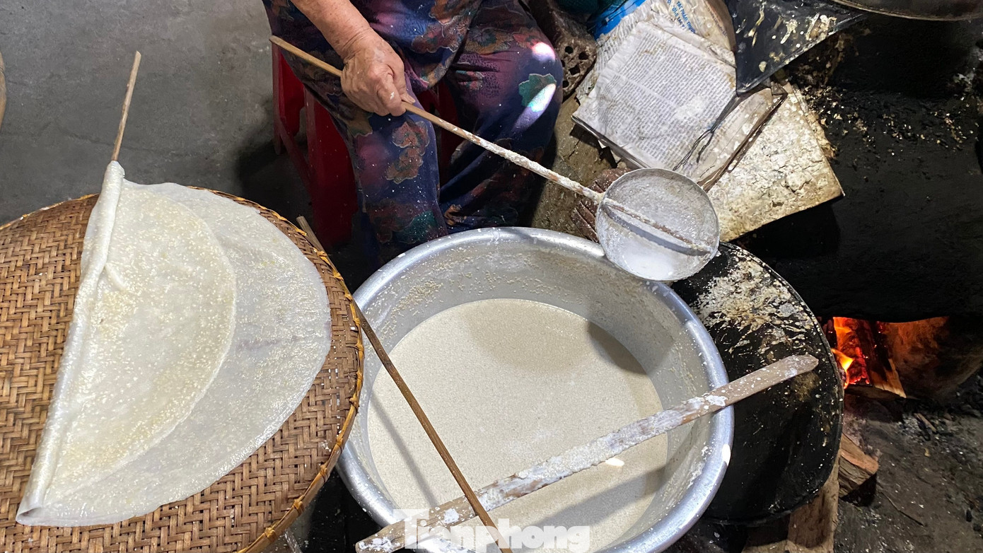 Công việc bắt đầu từ khoảng 2h sáng, khi người thợ xay bột, nhóm lửa, chuẩn bị tráng bánh. Bột gạo được pha theo bí quyết riêng của từng gia đình, đổ lên khuôn vải đặt trên nồi nước sôi. Người tráng bánh phải đứng liên tục bên bếp, vừa thao tác, vừa canh lửa để bánh chín đều. Ảnh: Thảo Thùy Dương.