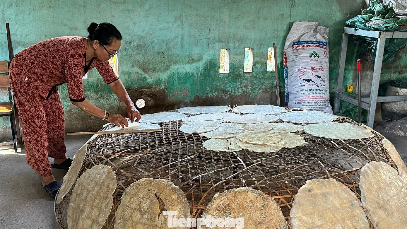 Bánh sau khi tráng được mang ra hong khô trên phên tre - giúp bánh định hình và đạt độ cứng nhất định. Ảnh: Thảo Thùy Dương.