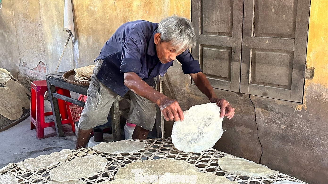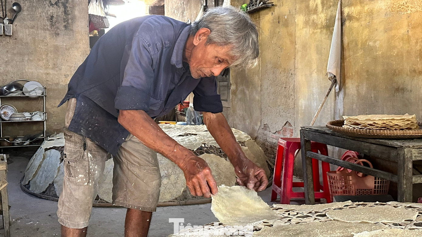 Ông Đặng Công Bê 75 tuổi, thôn Túy Loan Tây 1 cho biết mình cũng chỉ làm bánh tráng vào dịp cuối năm. Theo ông, làm bánh tráng một mình rất vất vả, phải thức khuya, dậy sớm và tốn sức, nhưng phải cố vì con cái không ai muốn theo nghề. Ảnh: Thảo Thùy Dương.