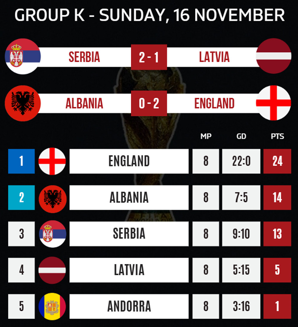 BXH chung cuộc bảng K vòng loại World Cup 2026 khu vực châu Âu