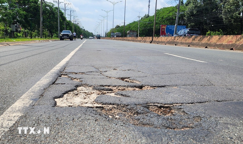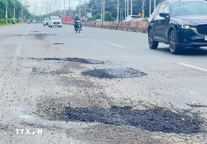 Đường ĐT.741 xuất hiện nhiều "ổ voi, ổ gà" gây nguy hiểm cho người đi đường. (Ảnh: Đậu Tất Thành/TTXVN)